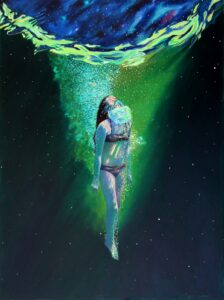 O’Connor: Yes, exactly, I was wanting the organic directions and the structure of the drawing to show. The backgrounds [of my paintings] are becoming more about the process in the last few years. Regarding my swimmers, they’ve been going off into the universe and it’s not something that I set out to do. It’s not what I had intended but I’m feeling connected to the women. I think women in our society are not as appreciated as they should be, especially older women, and a lot of my models are in their 80s. I think about them… some were doctors or mothers… They were breaking barriers because of their age. When they were going to school, they weren’t supposed to go to school to be a doctor, they were just supposed to be a mother, and then now people just seem to disregard them. I wanted to show that these women are incredible, they’re goddesses and they’re the women that live next door to you. I really wanted to push the idea of these women being larger than life.