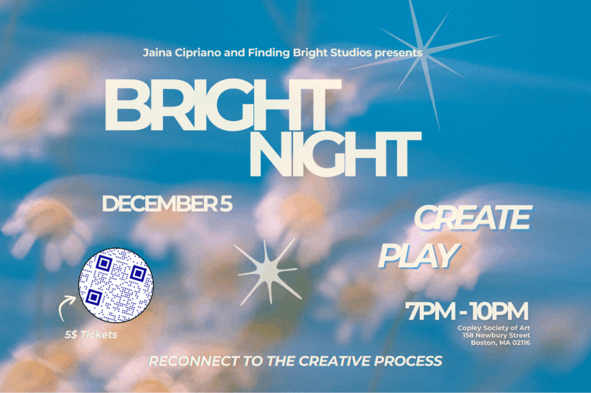 Welcome to Finding Bright Studios seasonal night of community building focused on using play to connect to the creative process – this time at The Copley Society of Art! reconnect with the creative process through play and community on December 5th!
