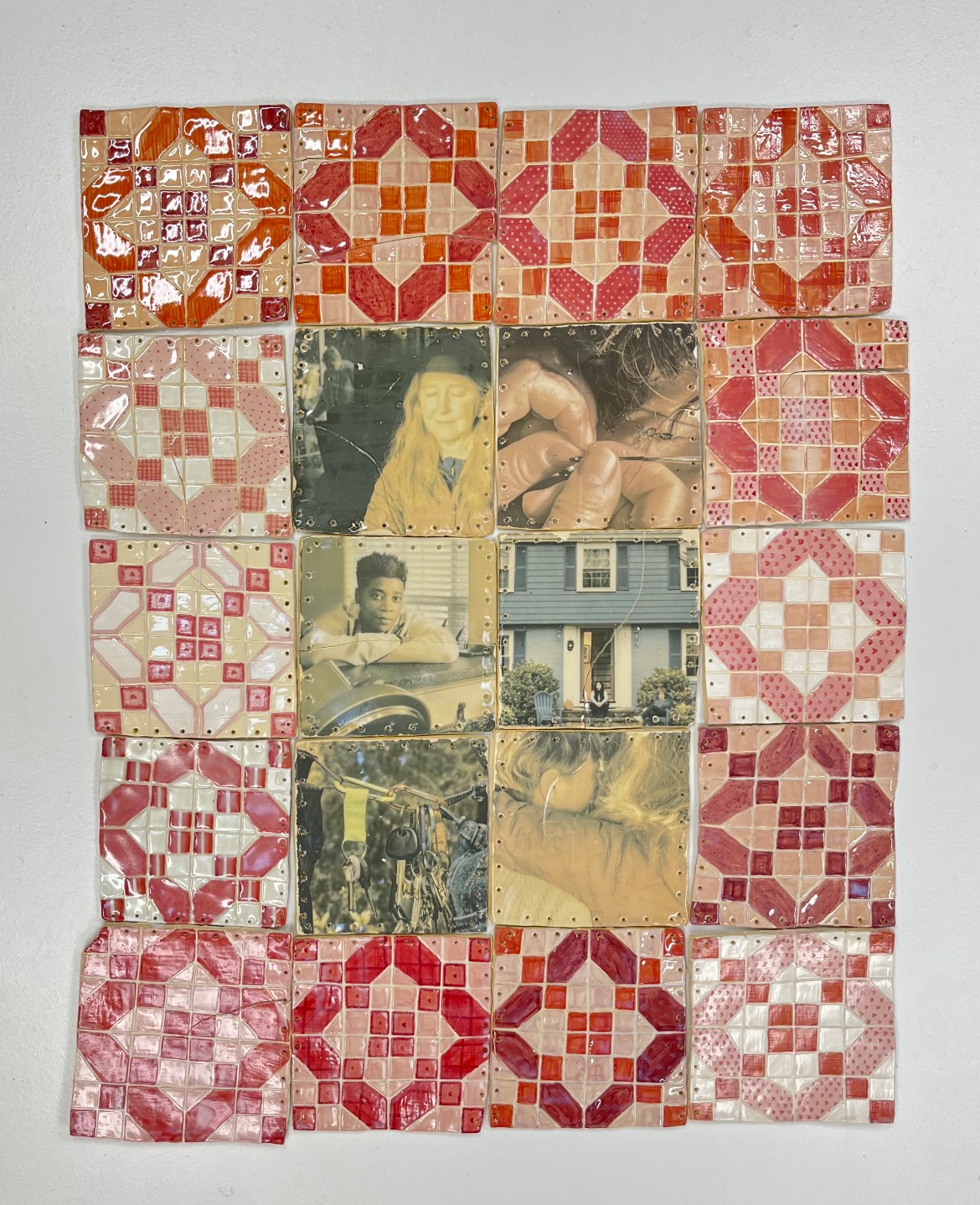This is a piece on the connection between older and younger generations of lesbians, creating space to show how you can have a fulfilling life and deep love as a lesbian. Using photos taken by a member of my community Alina Balseiro, who sought to reach out to the older lesbians in the Boston community and create connection. I then hand-built ceramic tiles to create a quilt to convey the feelings of legacies, archives being past down and community being created in the process.