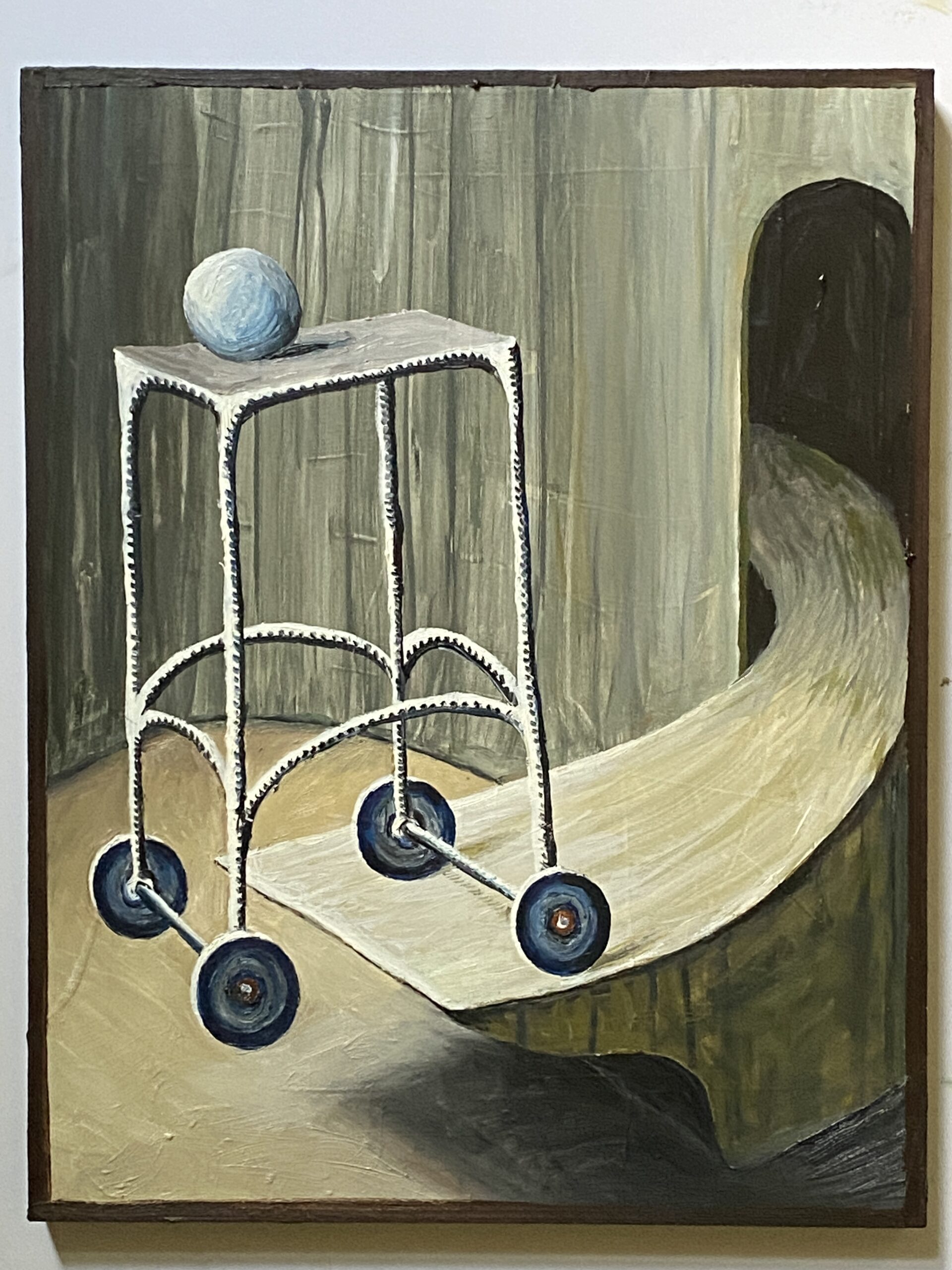 The ball (perhaps the earth) is riding on a tall cart. As it emerges from a tunnel it tries to turn right without falling.