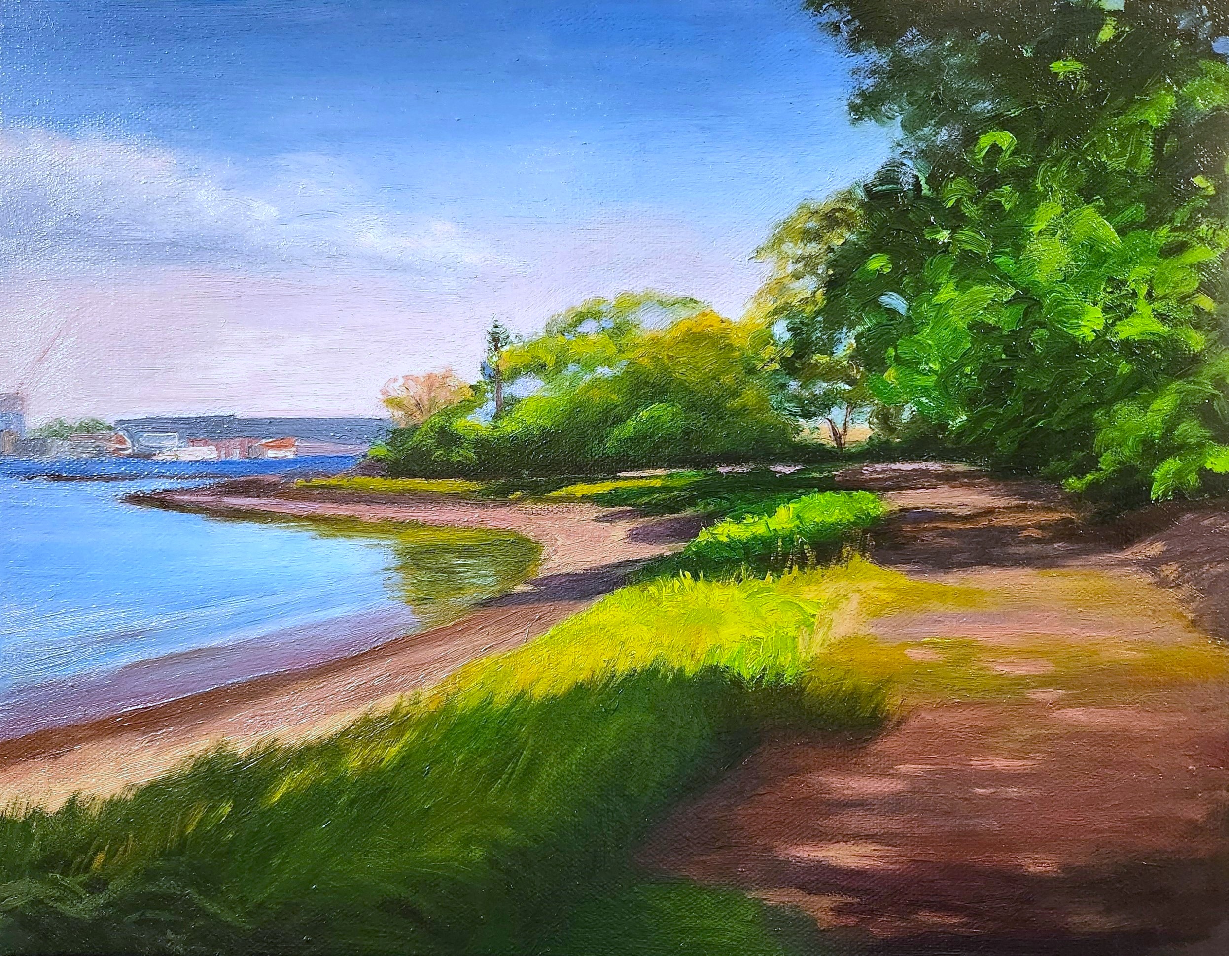 I painted this scene after seeing the illuminated path to Portsmouth Harbor from Pierce Island in Portsmouth, NH.