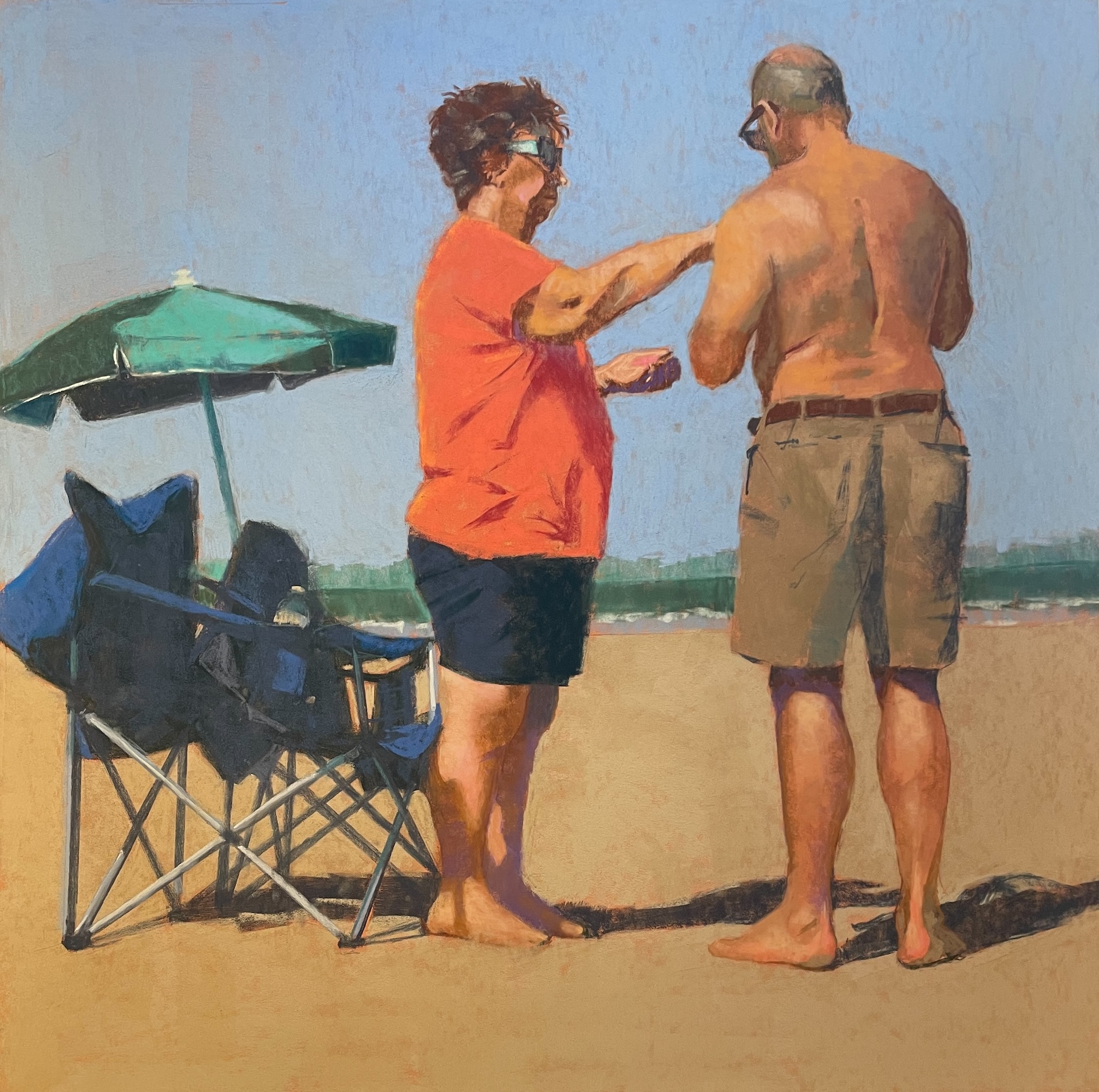 man and woman at beach; she is putting sunscreen on him