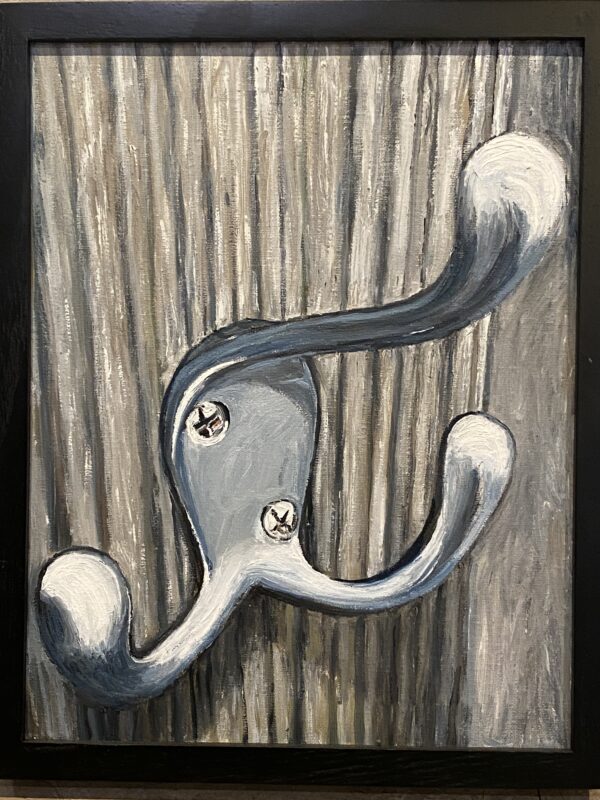 A painting of a shiny metal coat hanger discovered in the men’s room at Taco Bell, Coolidge Corner