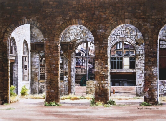 A native of Bethlehem, Pennsylvania, growing up just blocks from the blast furnaces of Bethlehem Steel Company, Carolyn was surrounded daily by the commanding structures and activities at the massive plant. When the company closed in 1995, she committed to memorializing it, knowing that it was so very important in the history of our country, and her own family, and realizing that those structures had influenced her painting and her choice of subject matter in many ways.