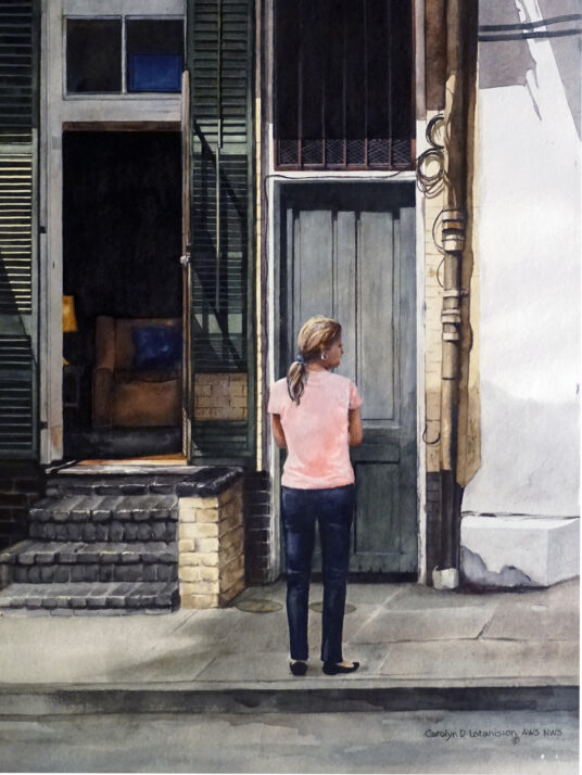 People and architecture have figured prominently in Carolyn’s work and in both cases urban scenes are frequently depicted. The strength and style of buildings and the many abstract patterns of light and dark they provide, the juxtaposition of people and architecture, and the connections they create, make a statement about the complexities of the time in which we live. Sometimes she’ll catch amusing and unexpected moments of life that suggest possibilities the viewer can interpret from his or her own perspective.