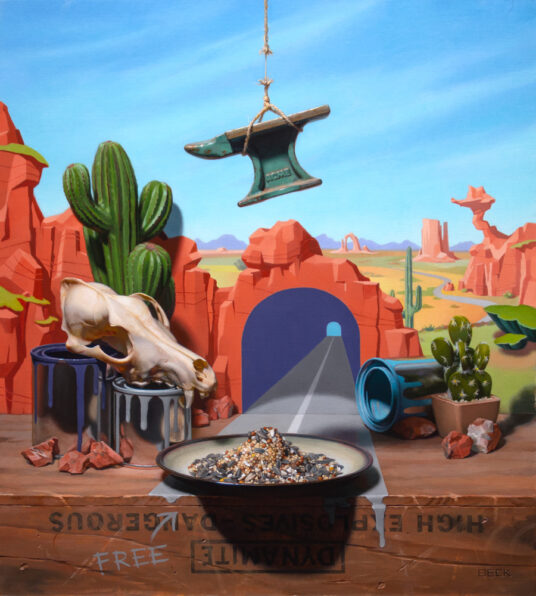 My paintings are representational in nature, but often surreal in composition and design. They are both familiar and unexpected. While grounded in reality using both scale and tromp l'oeil realism, I play with the viewers experience of both the two dimensional plan of the painting surface and three dimensional space it implies. I intend for each viewer to have an individual experience that evolves over the time. The longer you look, the more unfolds.