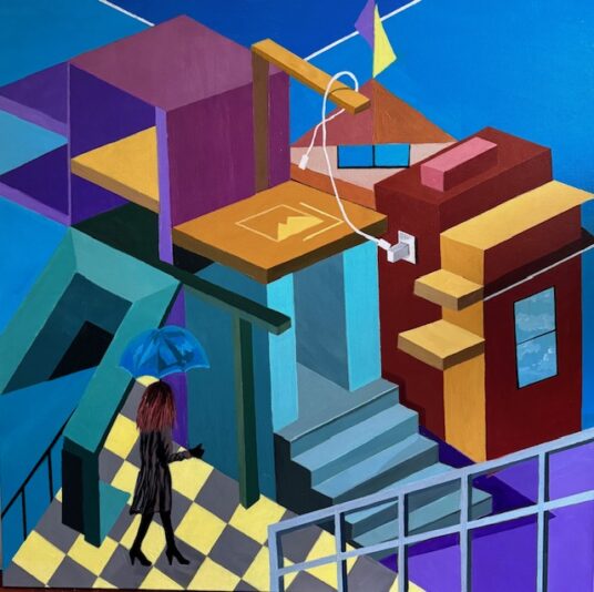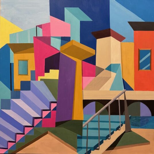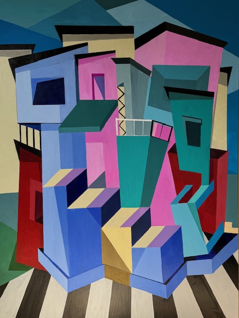 Her paintings explore modern structures as metaphors for human experience, how we build, connect, and sometimes fall apart—always with a sense of balance and hope.