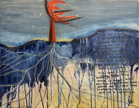Robin Colodzin combines painting and collage to create complex, textured surfaces that straddle representation and abstraction. She builds environments of depth and atmosphere where chaos gives way to order through pattern, color and theme. Bits and pieces of collage material – a ticket, a snippet of a photo, metal widgets, create touch points for a possible narrative. Robin often draws on poetry to inspire her work, transforming written imagery and meaning into a visual experience.